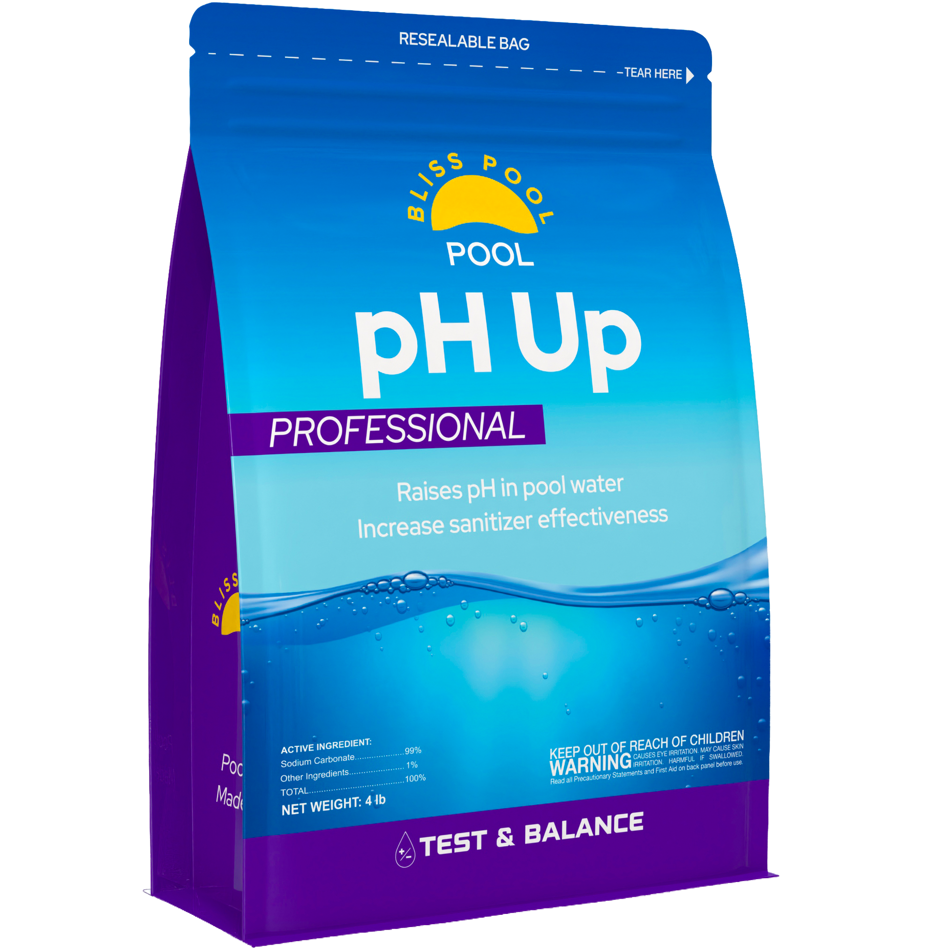 Bliss Pool pH Up is a fast dissolving pH increaser that raises low pH to protect pool equipment & surfaces and help prevent eye or skin irritation. Safe for all pool types and compatible with chlorine, bromine, saltwater and biguanide systems. Use when pH is below 7.2. Test pH twice a week with Bliss Pool Test Strips and get personalized product and dosage recommendations to maintain the ideal 7.2–7.8 range. Convenient 4 lb resealable bag for easy, reliable pH balancing.